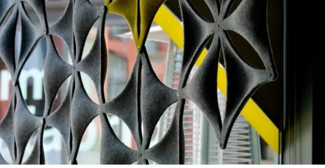 在室內聲學設計中,無紡布越來越多地被用作可消音的“設計元素”。例如裝在墻面和/或頂棚上的單塊鑲嵌板、整面的墻面裝飾和吊頂、開放式辦公區域用的消音隔板,或者用毛氈制造的整件家具。